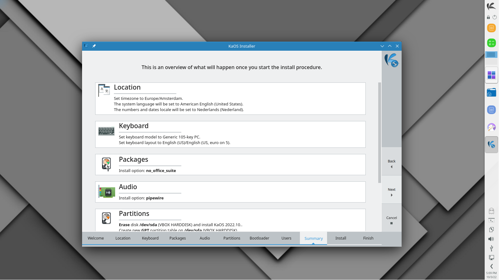 KaOS’ creation Croeso (Welsh for welcome) for helping with configuring a new install is included. It will run on the newly installed system and offers to adjust some 15 commonly used settings, includes a custom Wallpaper selector, distribution info, and the option to select packages to install from six different groups. It is written in QML and fits well with the Welcome application used in the Live system. The latter includes an Installation Guide.